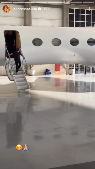 Na sequência, Andressa bem humorada divertiu os fãs ao reagir a uma viagem que o maridão, Gusttavo Lima está curtindo somente com os homens da família. O sertanejo viajou com os filhos e os avós dos herdeiros para uma pescaria. Nas redes sociais, a influenciadora mostrou todos embarcando no jatinho particular da família.