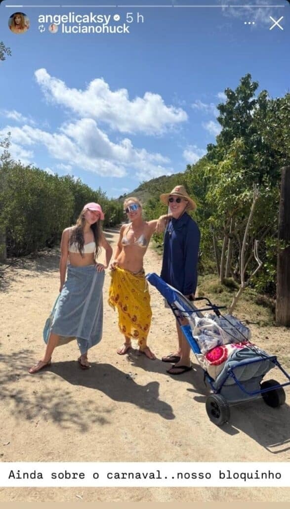 “Ainda sobre o carnaval… nosso bloquinho”, brincou o famoso ao surgir acompanhado da esposa e da filha em um caminho cercado de árvores para chegar até a praia. Ao posarem se locomovendo a bordo de um buggy, ele brincou: “nosso carro alegórico”. Por fim, Huck aproveitou para fazer uma declaração para a amada. “Minha Rainha”, legendou ao exibir uma foto da companheira.