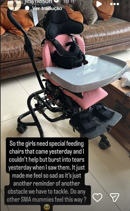 A cantora relatou como a chegada destas cadeiras a abalou. “Então, as meninas precisam de uma cadeira de alimentação especial que chegou ontem e eu não consegui segurar as lágrimas quando eu vi ela. É que faz eu me sentir tão triste porque é mais uma lembrança de mais um obstáculo que temos que enfrentar. Mais alguma mãe de criança com AME passando por isso?”.