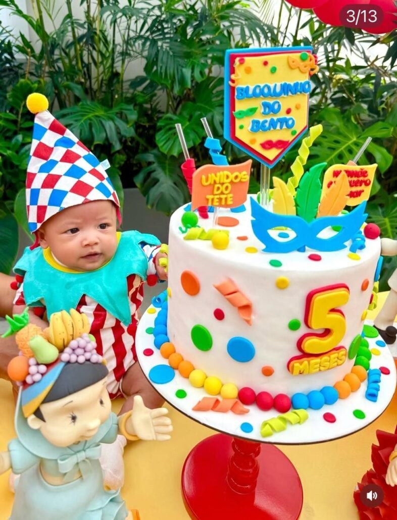 O tema escolhido para festejar mais um mês de Bento, não poderia ser diferente. Os artistas comemoraram a data em clima de carnaval! O bloquinho do filhote foi decorado com cores bem vibrantes, bonecos temáticos e um delicioso bolo. O doce ganhou plaquinhas divertidas, incluindo: “unidos do tetê” e “mamãe eu quero mamar”.