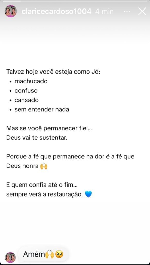 Em suas redes sociais, a mãe dos irmãos desaparecidos desabafou nas redes sociais. A mãe relembrou a passagem bíblic4 de Jó e falou sobre fé ao compartilhar uma reflexão. A reflexão dizia: “Talvez hoje você esteja como Jó: machucado, confuso, cansado, sem entender nada. Mas se você permanecer fiel…Deus vai te sustentar. Porque a fé que permanece na dor é a fé que Deus honra. E quem confia até o fim, sempre verá a restauração”. Ao mostrar esta reflexão, Clarice também escreveu: “Amém”.