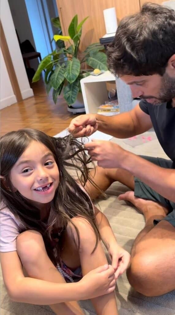 Porém, nem tudo são flores na vida dos papais. Ao retornarem do colégio, o famoso enfrentou um perrengue com a filhota. Acontece que ela surgiu com um pedaço de chiclete grudado em seu cabelo! “Momento ‘pai tirando chiclete do cabelo da filha’ e foi ela que me ensinou o método hahahaha”, brinco o famoso. Ao pesquisar na internet, a menina descobriu que usar gelo seria uma forma de desgrudar o doce e o papai logo utilizou a técnica!