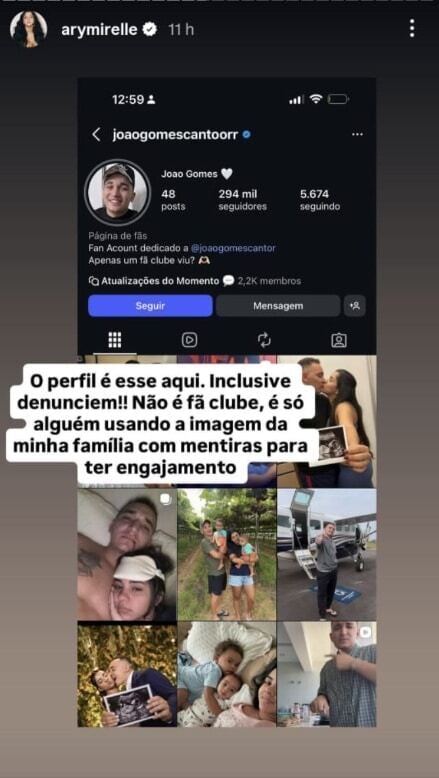 Na sequência, Ary mostrou uma foto de perfil que supostamente era de “fã clube”, que estava usando fotos dela e de sua família. “O perfil é esse aqui. Inclusive, denunciem!! não é fã clube, é só alguém usando a imagem da minha minha família com mentiras para ter engajamento”, disse a influenciadora.