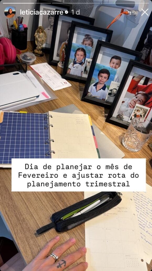 Neste início de semana, a mamãe deixou os fãs surpresos ao mostrar sua mesa de trabalho. Na noite deste domingo, Leticia surgiu preparando a agenda de compromissos para o mês que acaba de iniciar. A jornalista chamou a atenção ao exibir uma sequência de porta-retratos com fotos dos herdeiros.