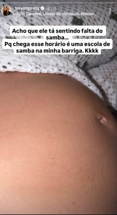 Após a folia, Lorena Improta tirou um tempinho para conversar com os seguidores. Nesta Nesta sexta-feira (27), a artista abriu uma caixinha de perguntas e respondeu alguns dúvidas dos fãs sobre seu bebê. Em um dos cliques, a mamãe mostrou seu barrigão e contou como o caçulinha estava mexendo. ” Acho que ele tá sentindo falta do samba”, disse ela que ainda completou: ” Porque chega esse horário é uma escola de samba na minha barriga kkk”. escreveu a mamãe ao falar como seu bebê esteva mexendo em sua barriga.