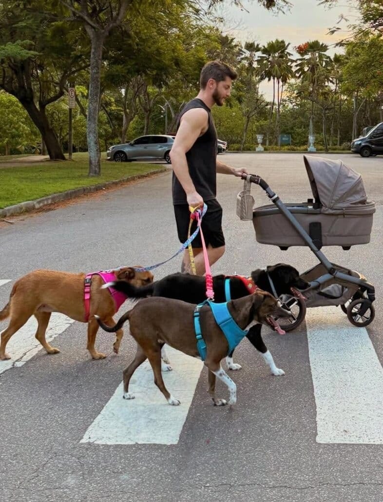 Klebber Toledo surge passeando com a bebê e 3 cachorros