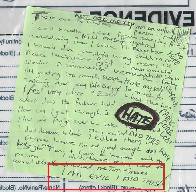 Assim, os investigadores concluíram que as m0rtes dos bebês foram causadas por Lucy Letby. Após terem revistado a casa de Lucy, os investigadores encontraram um bilhete no qual ela escreveu: “Eu sou má, eu fiz isso, e não mereço viver. Eu os m4tei de propósito, eu sou uma pessoa terr1vel”. Ao ser questionada pelos investigadores sobre este bilhete, Lucy disse apenas: “Sem comentários”.