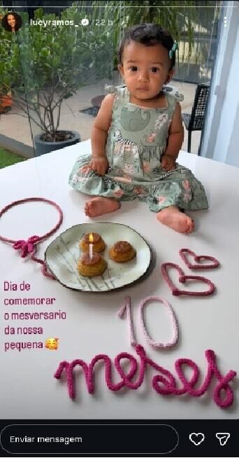 Para comemorar o data especial da herdeira, a artista fez um bolinho simples para não deixar passar em branco. No registro publicado por ela, a garotinha surgiu em cima da mesa com um bolinho estilo cupcake e uma velinha. “Dia de comemorar o mêsversário da nossa pequena”, se declarou Lucy Ramos.