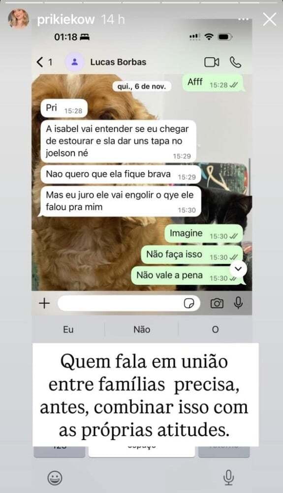 Não demorou para uma das irmãs de Isabel Veloso dar sua versão sobre os fatos. Priscila Kiekow mandou um recado para Lucas e garantiu que as coisas não são bem como ele falou. Ela também exibiu prints de trocas de mensagens que evidenciam que a convivência do rapaz com os pais da esposa não é das melhores. Além de mensagens não respondidas em que pedem para ver o bebê.