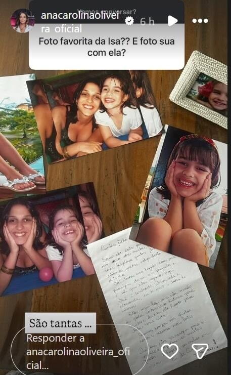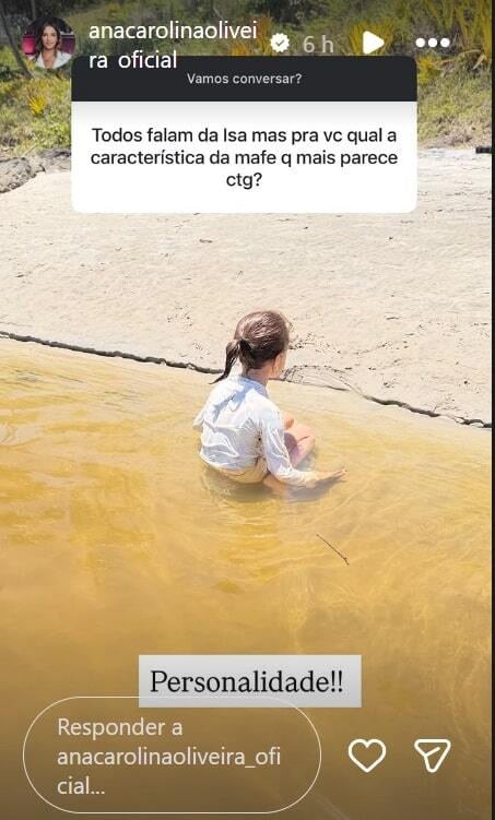 Agora, ao responder algumas perguntas dos internautas, Ana Carolina Oliveira falou de seus filhos. Ana Carolina foi perguntada sobre o que a sua caçula tem de parecido consigo. “Todos falam da Isa, mas pra você qual é a característica da Mafê que mais parece contigo?”, questionou uma internauta. E diante da pergunta, Ana Carolina mostrou uma foto rara de sua filha caçula e disse: “A personalidade!”.