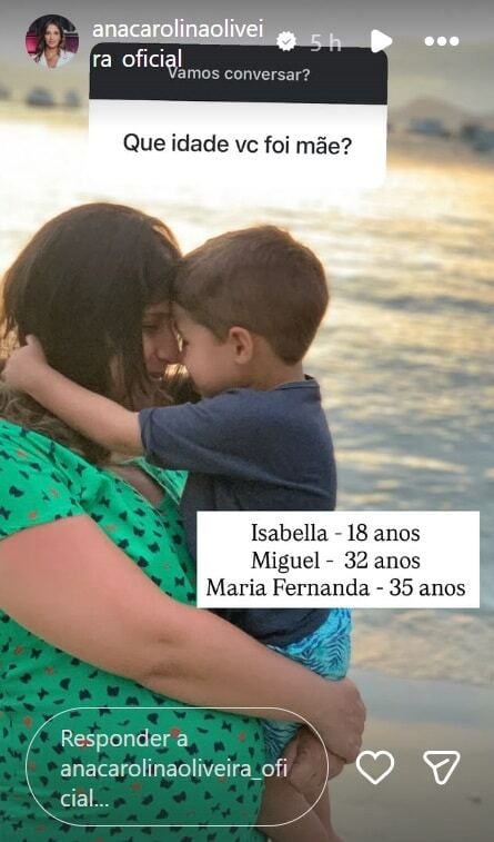Uma internauta também perguntou: “Com qual idade você foi mãe?”. E ela exibiu uma lindo foto grávida de sua caçula e com o filho Miguel nos braços e respondeu: “Isabella: 18 anos; Miguel, 32 anos; Maria Fernanda: 35 anos”.
