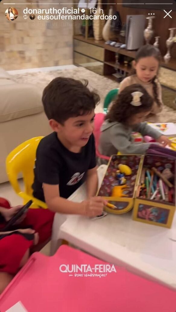 Há alguns dias, Léo surgiu em um passeio com a vovó. Mesmo não morando mais com ela, o garotinho tem contato e costuma passar alguns estabelecidos junto com Dona Ruth. Acompanhados de várias crianças, eles se divertiam em um parque, foram em uma exposição e brincaram bastante. Os momentos juntinhos deixaram saudades e a avó mostrou em seu perfil o pequeno desenhando e pintando com os amiguinhos. “Quinta-feira! Boas lembranças”, escreveu a mãe da artista ao postar a memória.