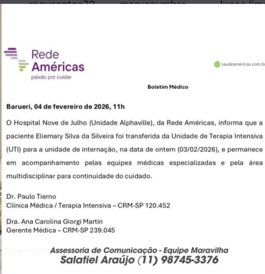 A nota assinada pelo Dr. Paulo Tierno, Clínica médica e terapia intensiva, e pela Dra. Ana Carolina Giorgi Martin, gerente médica, diz: “Barueri, 04 de fevereiro de 2026, 11h. O Hospital Nove de Julho (Unidade Alphaville) da Rede das Américas, informa que a paciente Eliemary Silva da Silveira foi transferida da Unidade de Terapia Intensiva (UTI) para a unidade de internação na data de ontem (03/02/2026). E permanece em acompanhamento pelas equipes médicas especializadas e pela área multidisciplinar para continuidade do cuidado”.