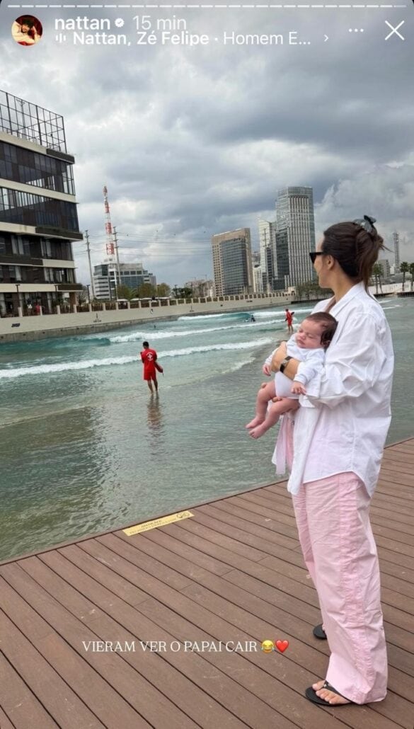 Nesta semana, a pequena foi dar um passeio com os pais. Em seu perfil, o cantor surgiu se divertindo em uma diferente experiência. Ele foi pegar ondas em uma piscina artificial! “A família toda vai ver a aula de surf. Vamos lá! 1ª vez tentando”, disse Nattan ao surgir no local. Ele ainda clicou sua mini torcedora no colo da mamãe assistindo cada caldo que o pai tomou! “Viveram ver o papai cair”, brincou.