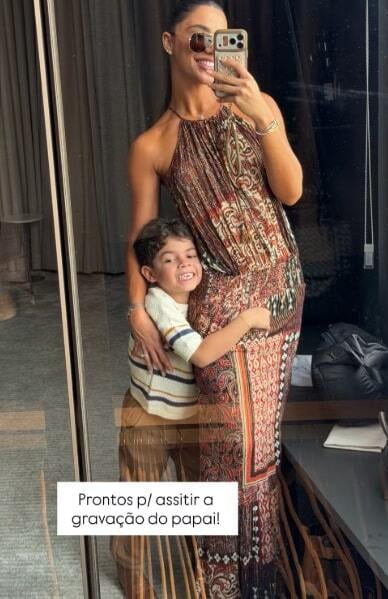 No registro, a influenciadora apareceu usando um vestido com estampas em marrom e vermelho, óculos escuros que complementavam o look. Já o garotinho surgiu com um lindo sorriso diante da câmera da madrasta, enquanto todo estiloso aproveitava para mostrar um lookinho fofo de camisa de tricô e calça jeans. “Prontos para assistir a gravação do papai”, escreveu legendou a noiva de Murilo Huff ao compartilhar o clique ao lado do enteado.