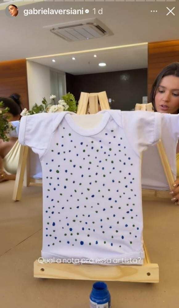 As convidadas ainda se divertiram ao colorir alguns bodies que poderão ser usados pelo neném daqui alguns dias. Gabriela Versiani mostrou sua obra de arte e se divertiu com o resultado. Ela decorou a peça com vários pontinhos azuis e verdes. “Qual a nota pra essa artista?”, brincou.