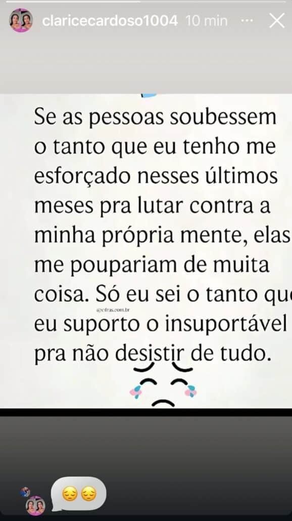 Em meio às mudanças nas buscas por seus filhos, a mãe das duas crianças desaparecidas em Bacabal no Maranhão, Clarice Cardoso desabafou. Ela compartilhou um desabafo nas redes sociais que dizia: “Se as pessoas soubessem o tanto que eu tenho me esforçado nos últimos meses pra lutar contra a minha própria mente, elas me poupariam de muita coisa. Só eu sei o tanto que eu suporto o insuportável pra não desistir de tudo”.
