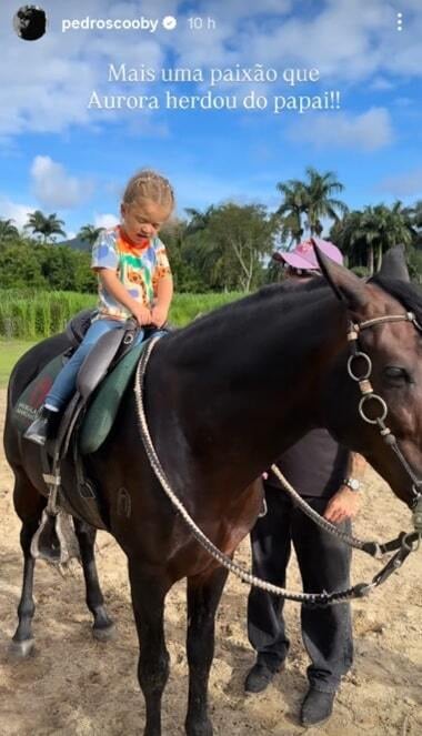 No clique, Aurora surgiu toda fofa esbanjando autonomia e muita segurança ao montar no animal. Todo orgulhoso da conquista da filha, o sufista se derreteu pela herdeira. “Mais uma paixão que Aurora herdou do papai”, disparou o surfista ao mostrar o clique da desenvoltura de sua herdeira ao mostrar uma nova paixão.