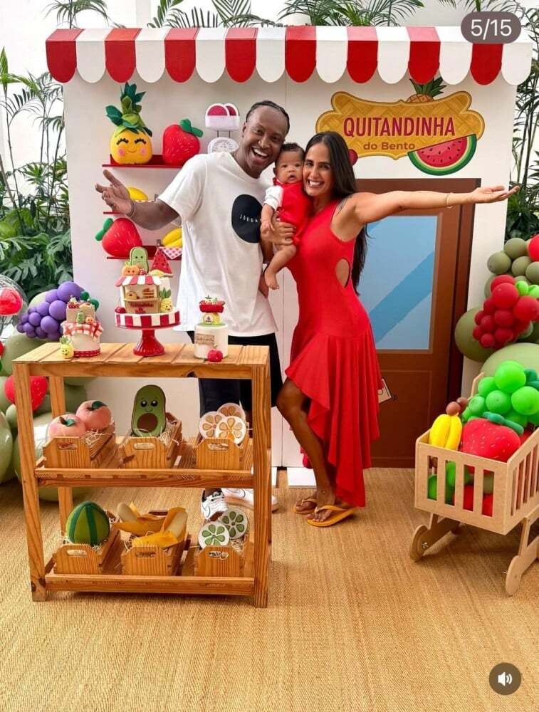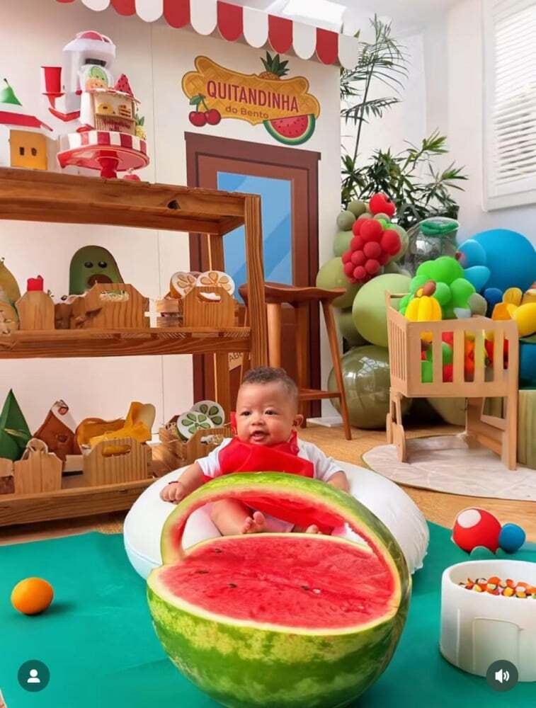 “Obrigado por trazer ainda mais alegria pro nosso lar… Teu sorriso ilumina tudo! Feliz 6 meses, nosso pequeno grande amor! Com muito amor, Mamãe e Papai”, finalizaram os famosos. A decoração feita em formato de vendinha de frutas contou com um bolo decorado com várias delas. O dono da festa usou um avental vermelho e depois se deliciou saboreando uma melancia!