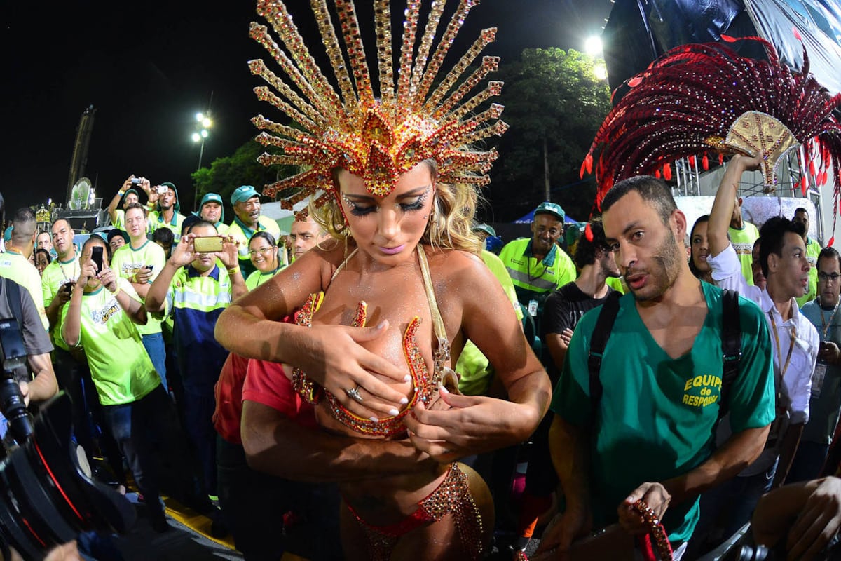 Andressa Urach desfila com os seios de fora como diva da Leandro de Itaquera: "Fantasia está confortável"