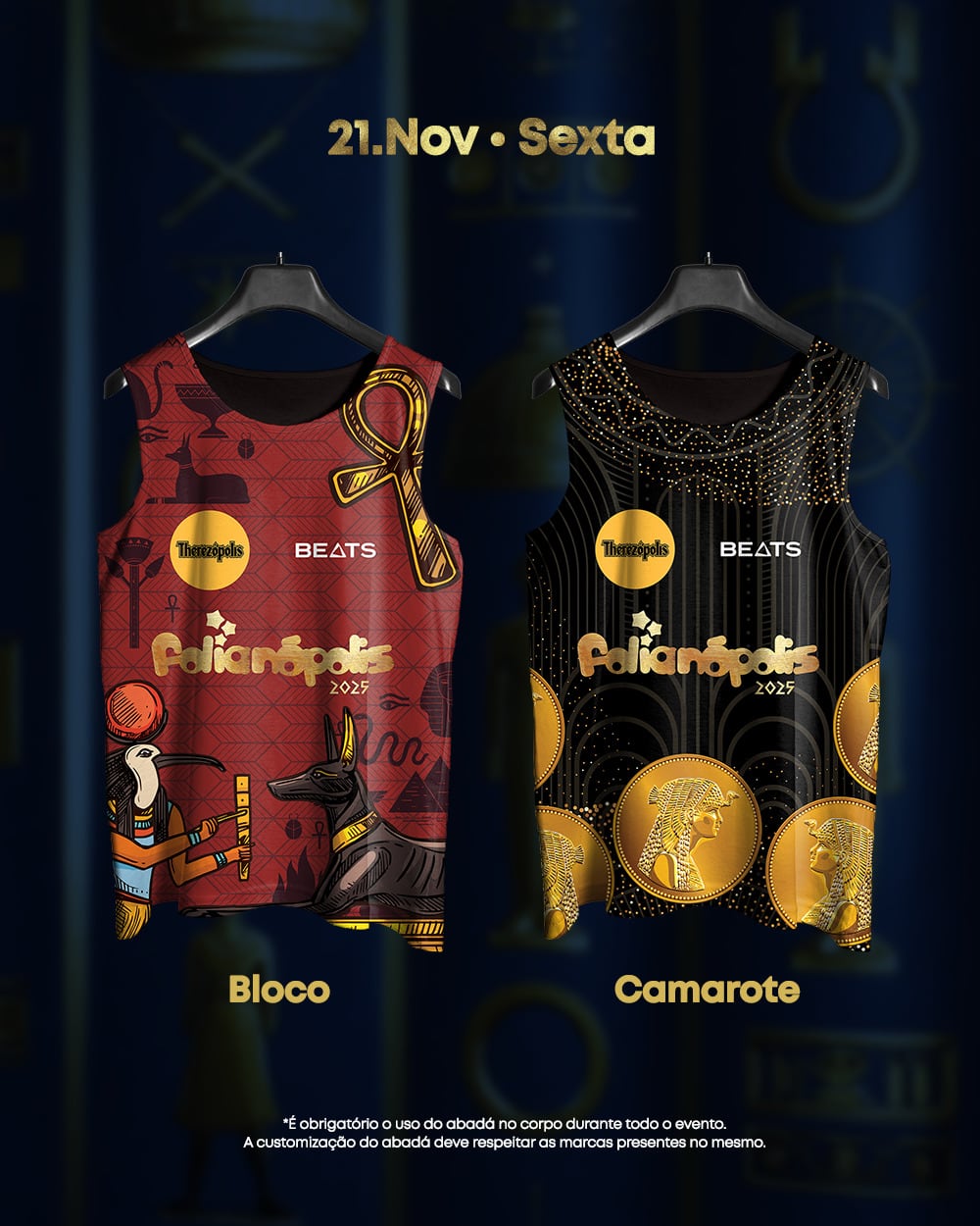 Os abadás de 2025 seguem a identidade visual inspirada no tema “Egito”, que toma conta de toda a cenografia e comunicação da micareta, traduzindo o universo místico e grandioso que marcará esta edição. A entrega no Floripa Airport transforma o terminal em um verdadeiro Lounge do Folia, com ativações de marca, espaços instagramáveis, customização de abadás, shows e experiências exclusivas para os foliões.