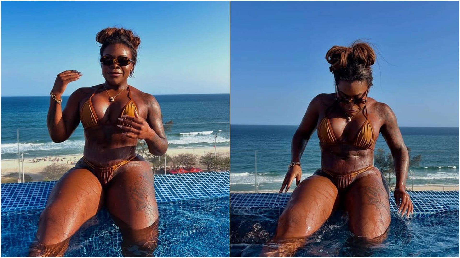 Para atualizar o bronzeado, Jojo Todynho escolheu um biquíni laranja minimalista, cabelos presos e óculos escuros para se proteger do sol. A cantora posou para fotos ao ar livre, aproveitando a vista panorâmica do mar à sua frente.