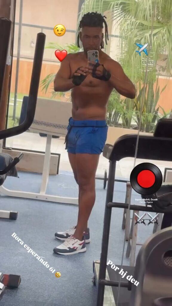 Na publicação, Beto ainda usou emojis de coração, piscadela e de um avião, além de incluir a música “Acôro, Ôcodê” da Cia de Ogans, como trilha sonora do momento fitness após o treino.
