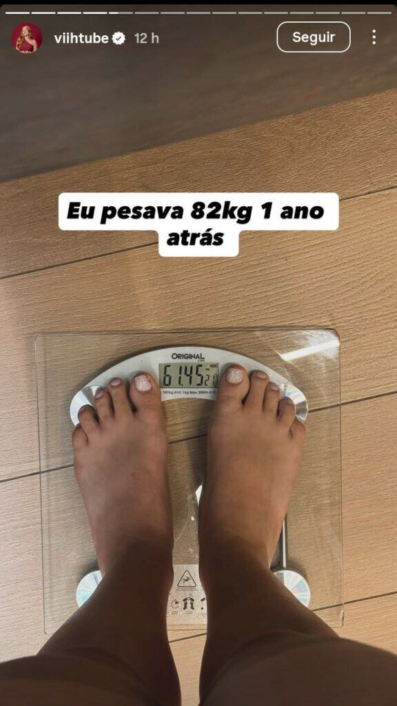 A influenciadora digital Viih Tube chamou a atenção dos seguidores ao revelar, nesta sexta-feira, os resultados de sua transformação física ao longo do último ano. Por meio dos Stories no Instagram, ela compartilhou uma imagem da balança marcando 61 kg, número que representa uma perda de 21 quilos em 12 meses. Há cerca de um ano, a criadora de conteúdo havia contado que pesava aproximadamente 82 kg.