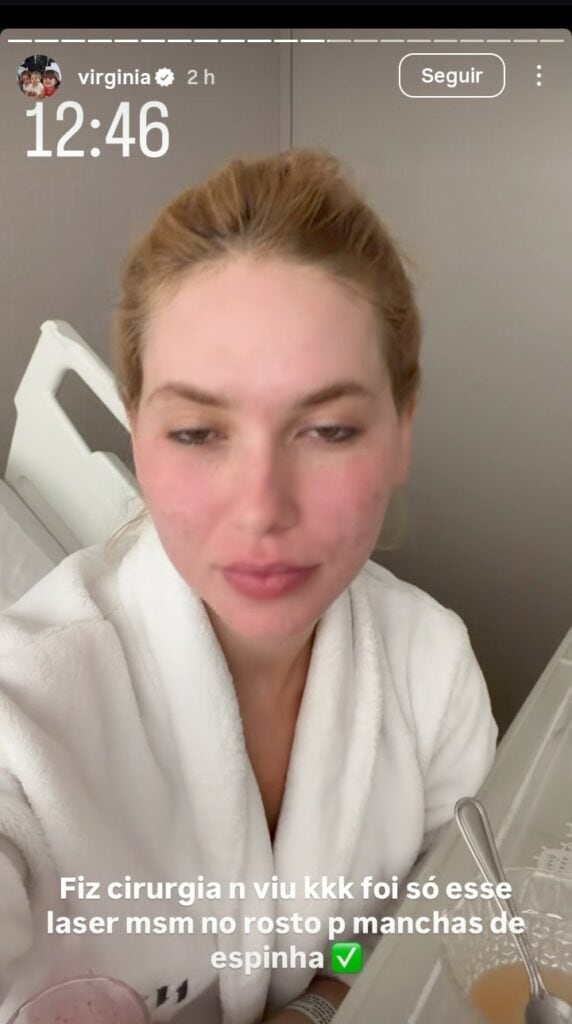 Por se tratar de um procedimento mais delicado e doloroso, a apresentadora foi sedada durante a aplicação do laser. Ela afirmou que já está recuperada e pronta para cumprir sua agenda. Virginia também adiantou que viajará novamente para o Rio de Janeiro ainda hoje.