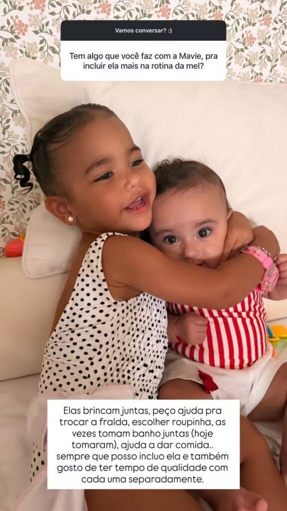 A influenciadora também explicou como envolve a filha mais velha nos cuidados com a caçula, equilibrando momentos em conjunto e tempo individual. Segundo Bruna, a participação de Mavie faz parte da rotina diária e fortalece o vínculo entre as irmãs.