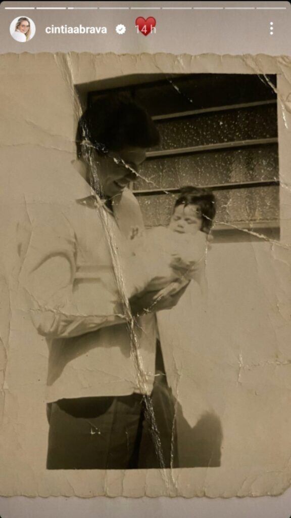 Cintia Abravanel também compartilhou uma lembrança afetiva no dia em que completou um mês da morte do apresentador. Em stories, a primogênita postou uma foto antiga em preto e branco, mostrando o pai segurando-a quando ainda era bebê. A imagem apresentou marcas do tempo e sinais de desgaste, reforçando a importância da memória afetiva. Veja: