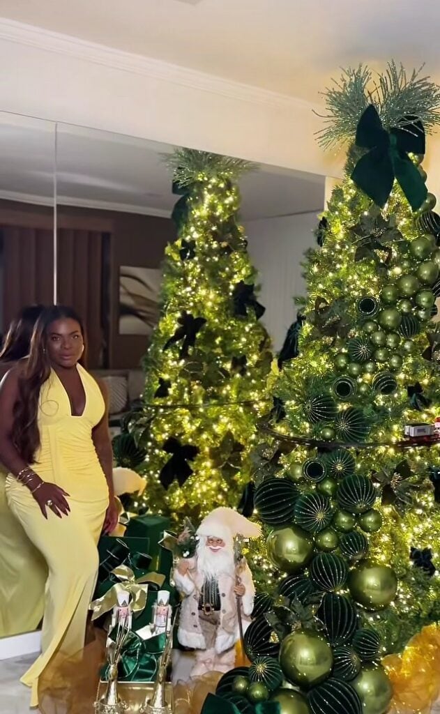 Na postagem publicada no Instagram, é possível ver uma árvore alta, decorada em tons de verde e amarelo, com laços e um pequeno trenzinho circulando a base. A mesa posta segue o mesmo padrão de cores e detalhes, completando a ambientação natalina exibida pela cantora.