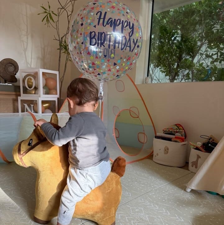Em seu perfil no Instagram, a modelo compartilhou uma sequência de imagens pouco habituais, acompanhando diferentes fases do primeiro ano de vida do filho. No registro principal, o bebê surge em um momento de diversão sobre um cavalinho de pelúcia, ao lado de um balão comemorativo com a frase “Happy Birthday”, em celebração à data especial.