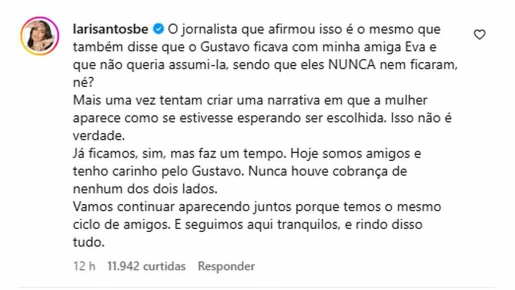 Segundo a publicação, Larissa Santos acreditaria que a escolha por manter discrição estaria ligada a sentimentos ainda existentes por Ana Castela, de 22. Diante da informação, a influenciadora comentou diretamente no post e questionou a credibilidade da narrativa divulgada. “O jornalista que afirmou isso é o mesmo que também disse que o Gustavo ficava com minha amiga Eva e que não queria assumi-la, sendo que eles NUNCA nem ficaram, né?”, escreveu.