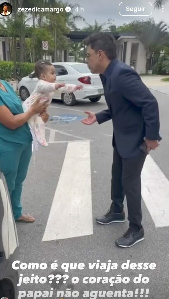 Zezé dividiu com os seguidores um momento de ternura ao mostrar a despedida da filha de 10 meses. Nas imagens, Clara aparece relutando em deixar o pai enquanto é entregue à babá. Com o coração apertado, Zezé escreveu nos stories: “Como é que viaja desse jeito? O coração do papai não aguenta!”.