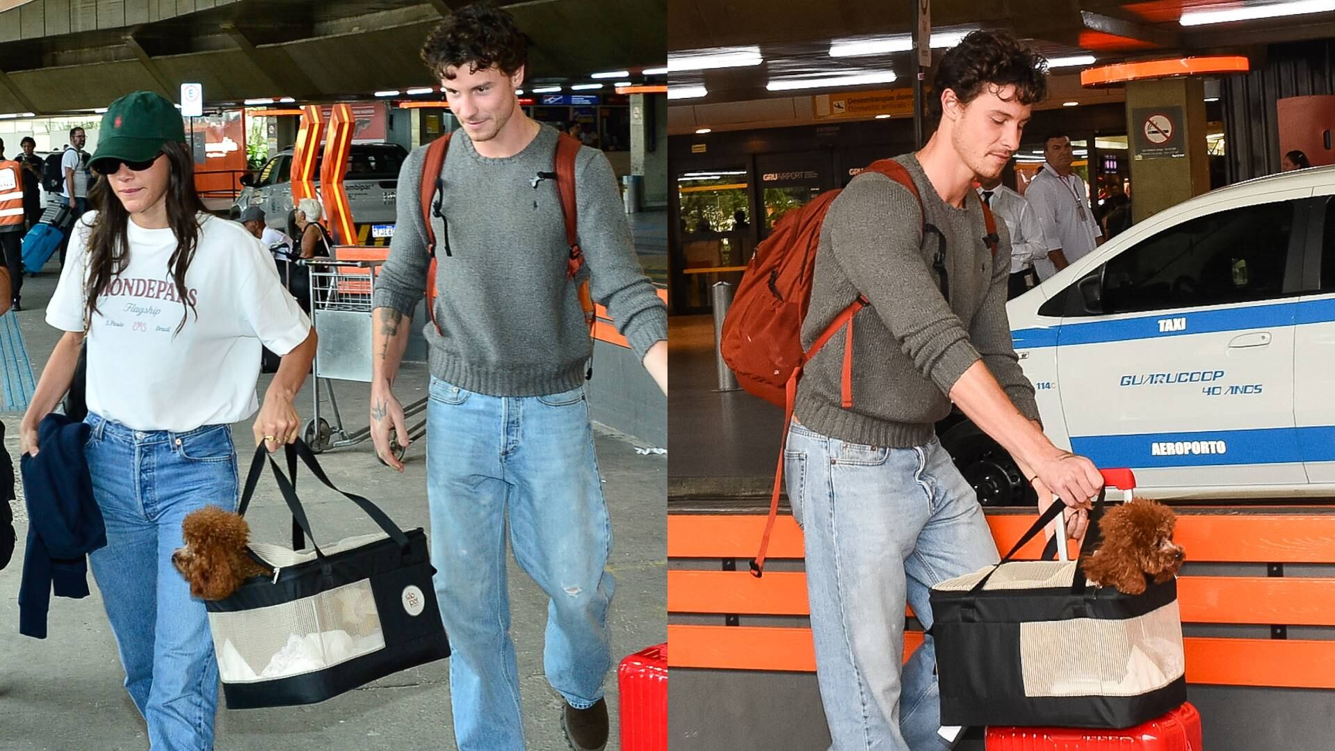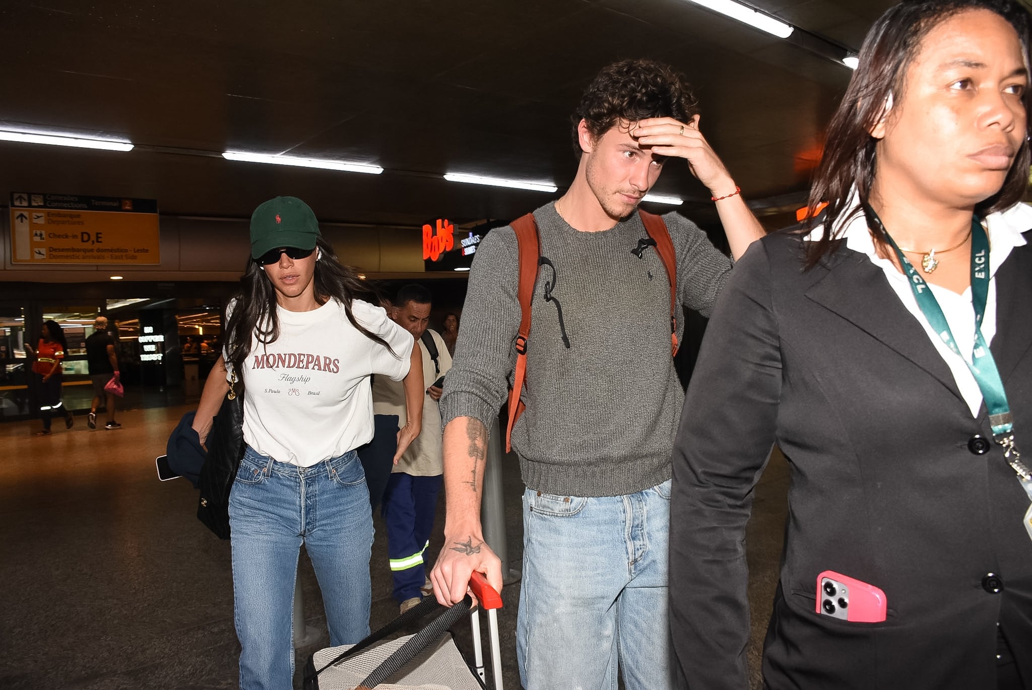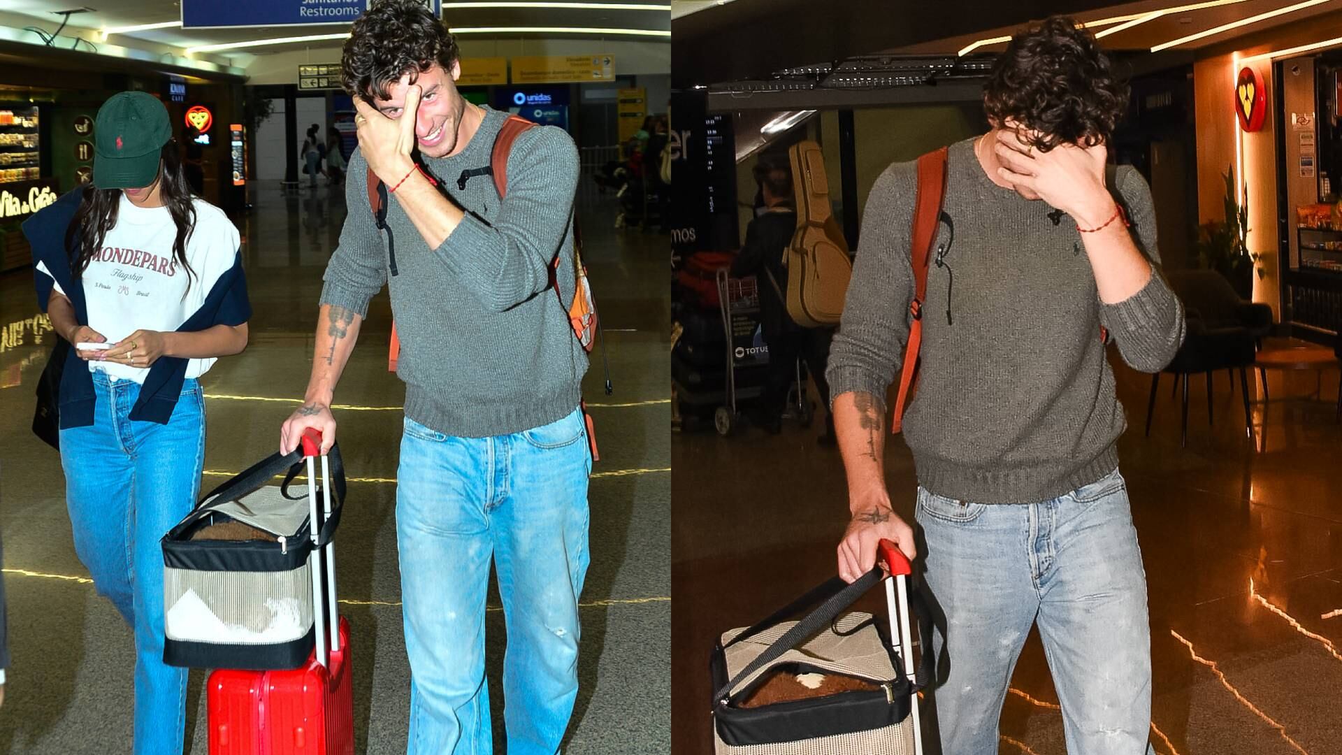 Atriz e cantor, que estariam vivendo um romance, tentaram esconder o rosto dos paparazzi ao desembarcarem em aeroporto de SP