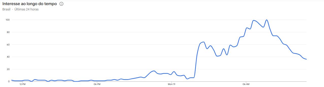 O levantamento feito pelo R7 com auxílio do Google Trends, ferramenta que monitora as principais buscas da plataforma, mostra que o pico de buscas foi registrado às 07h40 desta segunda. Confira: