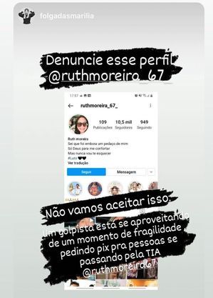 "Não vamos aceitar isso. Um golpista está se aproveitando de um momento de fragilidade pedindo pix para as pessoas se passando pela Ruth Moreira", postou a mãe da cantora nos stories do Instagram.