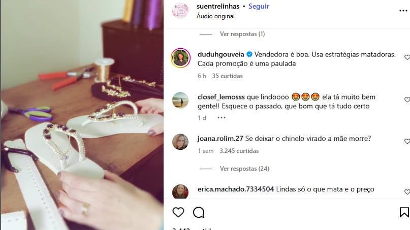 Suzane von Richthofen conquistou mais de 100 mil novos seguidores em uma rede social, mas agora tem que lidar com os comentários de suas publicações. Seu perfil, conhecido como Su Entre Linhas, que vende chinelos personalizados com pedrarias e outros tipos de artesanato, já conta com 132 mil followers, até a publicação desta nota.