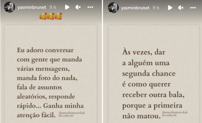 A influenciadora falou ainda sobre sua admiração por pessoas que se mostram mais disponíveis. "Eu adoro conversar com gente que manda várias mensagens, manda foto do nada, fala de assuntos aleatórios, responde rápido... Ganha minha atenção fácil", repostou Yasmin.