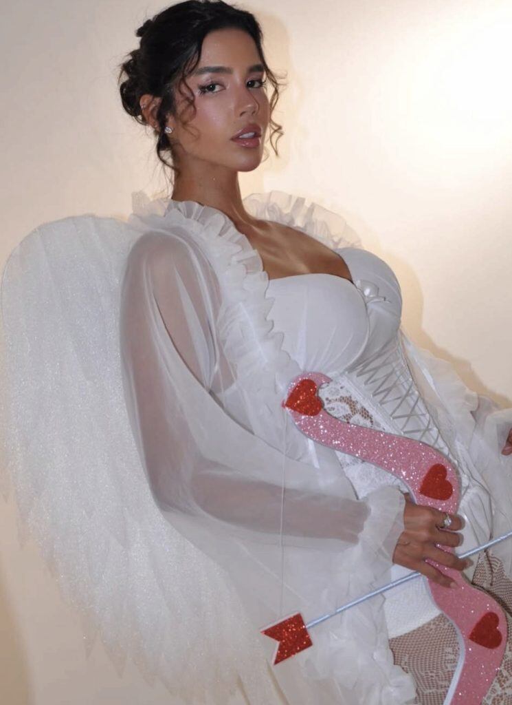 Com asas brancas, um conjunto de lingerie rendado coberto por uma leve transparência, meias arrastão e saltos finos, a influencer se transformou no mensageiro do amor para homenagear a jovem influenciadora Liz Macedo, que completou 16 anos.