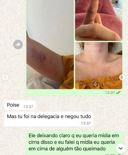 Nos diálogos apresentados, Marcela Tomaszewski confronta Dado Dolabella sobre episódios de violência física, afirmando categoricamente que mentiu publicamente para proteger a imagem dele. “Nenhum homem nunca tinha encostado em mim, e você encostou”, dispara ela em uma das mensagens. A modelo detalha as agressões, mencionando um “tapão na cara” que ainda doeria e “vários socos na cabeça”.