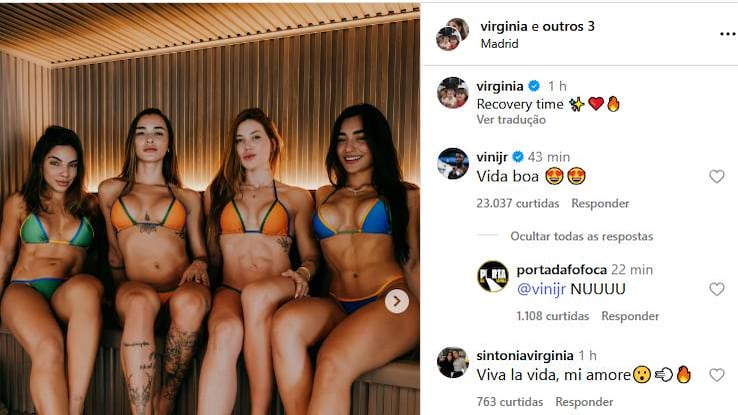 Recentemente, Vini Jr. comentou uma foto de Virginia em uma rede social, usando emojis que expressam paixão. A foto foi compartilhada por Virginia enquanto ela estava em Madri, na casa do jogador, e recebeu mais de 34 mil curtidas em menos de uma hora.