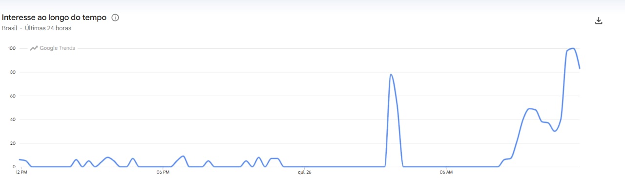O levantamento feito pelo R7 com auxílio do Google Trends, ferramenta que monitora as principais buscas da plataforma, mostra que o pico foi registrado às 11h24 desta quinta (26). Confira: