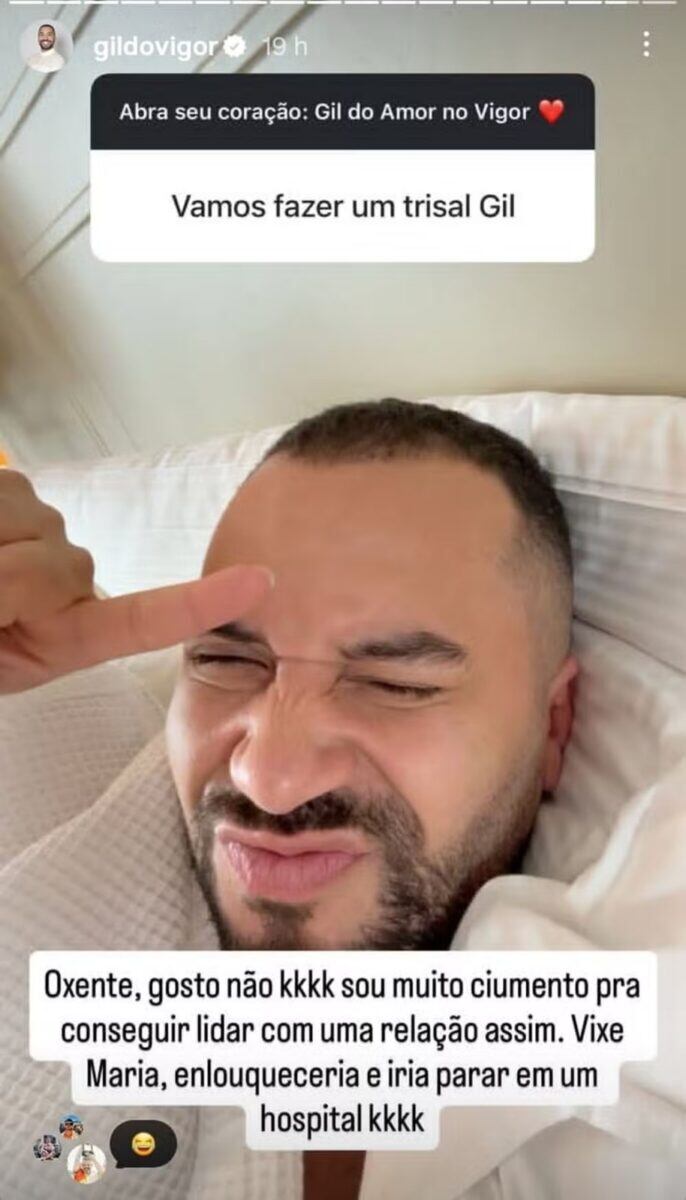 Gil do Vigor, de 34 anos, virou assunto nas redes sociais após abrir uma caixinha de perguntas no Instagram. Entre as mensagens, um seguidor sugeriu a formação de um trisal. No entanto, o economista descartou a ideia de forma imediata. Além disso, deixou claro que não se vê nesse tipo de relação.