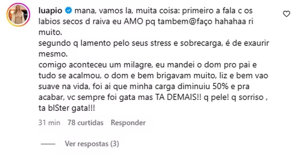 Na interação, Luana Piovani demonstrou empatia e dividiu sua própria experiência. “Comigo aconteceu um milagre, eu mandei o Dom pro pai e tudo se acalmou”, escreveu, explicando que os conflitos frequentes entre os filhos afetavam diretamente sua rotina. Ela ainda elogiou a colega, afirmando: “Você sempre foi gata, mas TÁ DEMAIS!!”.