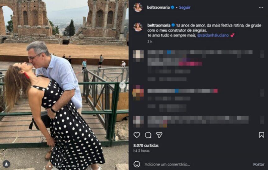 A jornalista Maria Beltrão, de 54 anos, comemorou nesta terça-feira (11) seus 13 anos de casamento com o advogado Luciano Saldanha e encantou os seguidores ao compartilhar fotos raras do casal nas redes sociais.