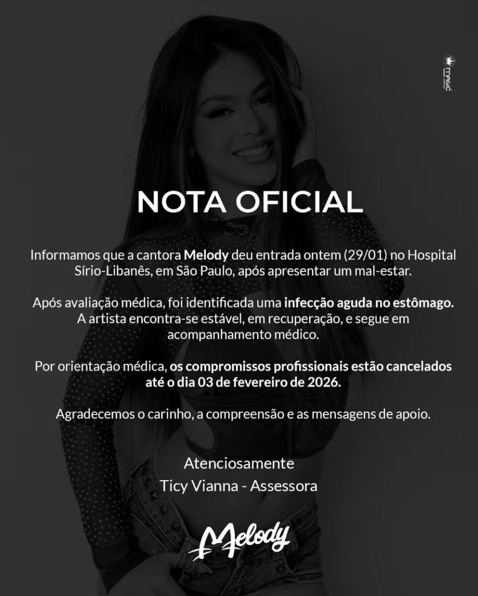Após avaliação médica, Melody foi diagnosticada com uma infecção aguda no estômago. Segundo o comunicado oficial, a cantora está em estado estável, apresenta boa resposta ao tratamento e segue sob acompanhamento médico. Por recomendação da equipe de saúde, todos os compromissos foram suspensos até o dia 3 de fevereiro de 2026.