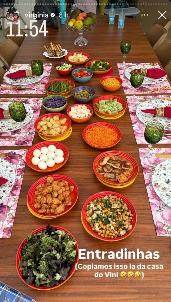 “Entradinhas (copiamos isso lá da casa do Vini)”, escreveu Virginia Fonseca, acompanhada de emojis de risada na legenda, ao mostrar as verduras e legumes do almoço organizados em pequenos pratos individuais.