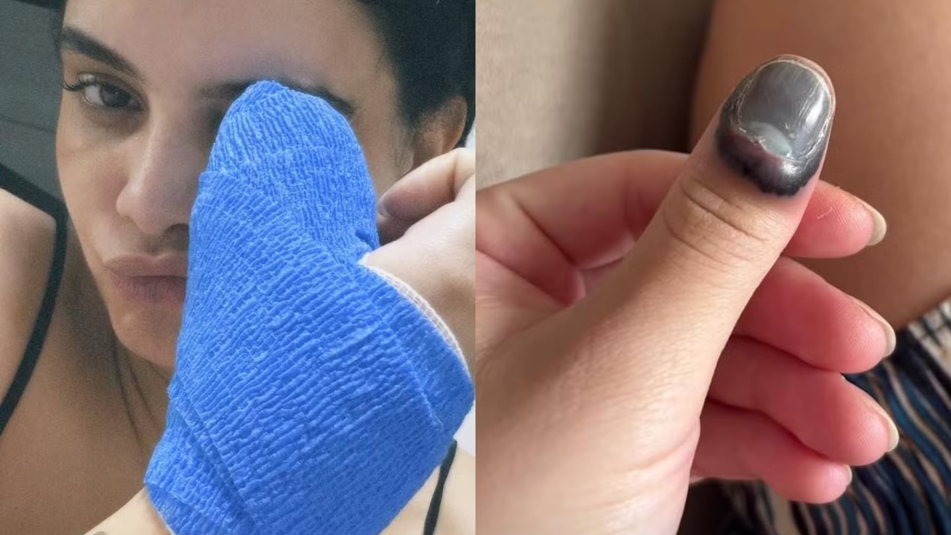 A artista contou nas redes sociais que prendeu o dedo polegar da mão direita na porta do carro e só percebeu a gravidade da situação depois, ao notar um hematoma na unha.